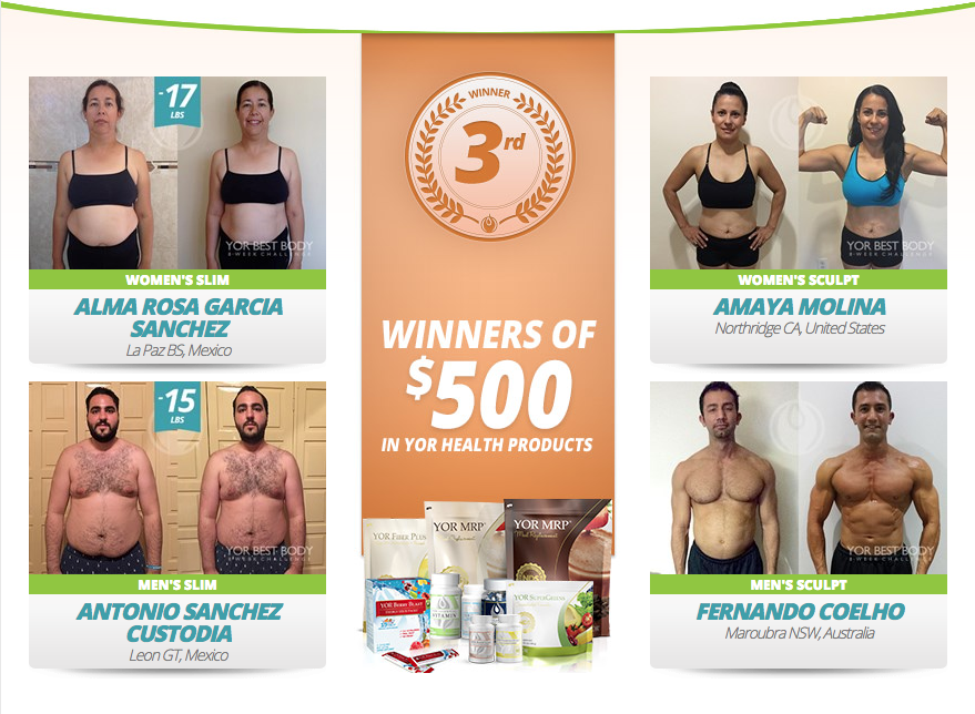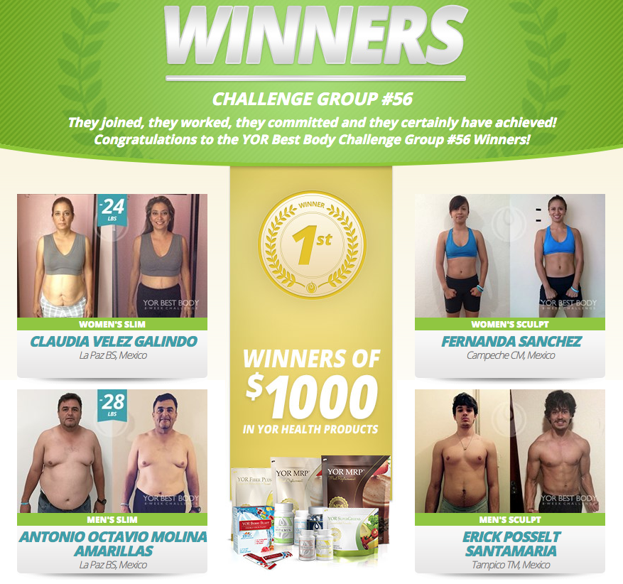 We are honored to announce the winners of Challenge Group #56. Their body transformations are a testament to the Real Results anyone can enjoy by combining the YOR Best Body 8-Week Challenge with YOR Health products.